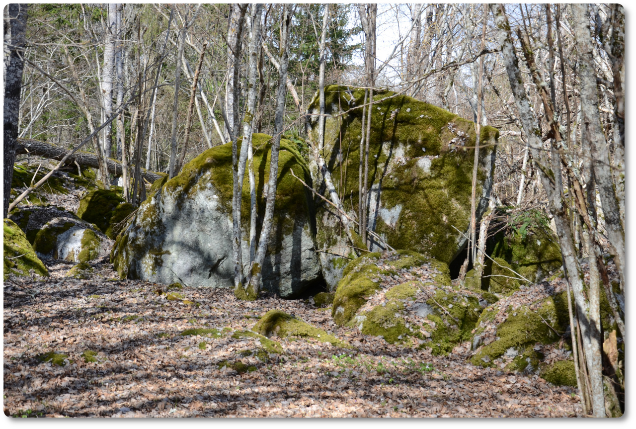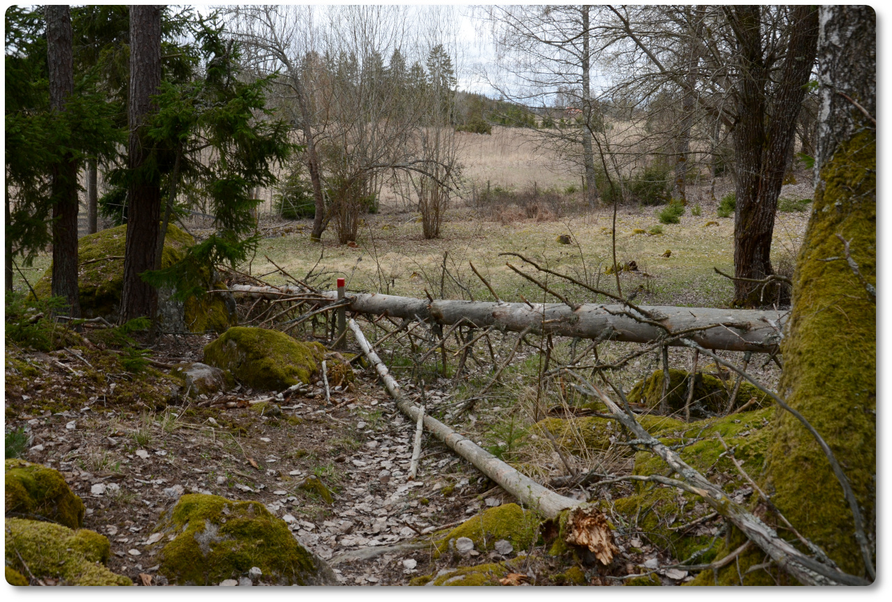 April, 2023. Här ligger ett av de större stenblocken i områder. Vi går runt och kollar från andra sidan.