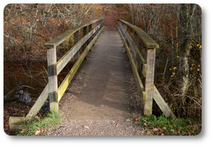 Oktober, 2024. Kung Björns bro fotograferad från den östra sidan om Hågaån. Om man fortsätter rakt fram på stigen på andra sidan bron kommer man till Kung Björns hög, men vi fortsätter på den östra sidan om Hågaån.