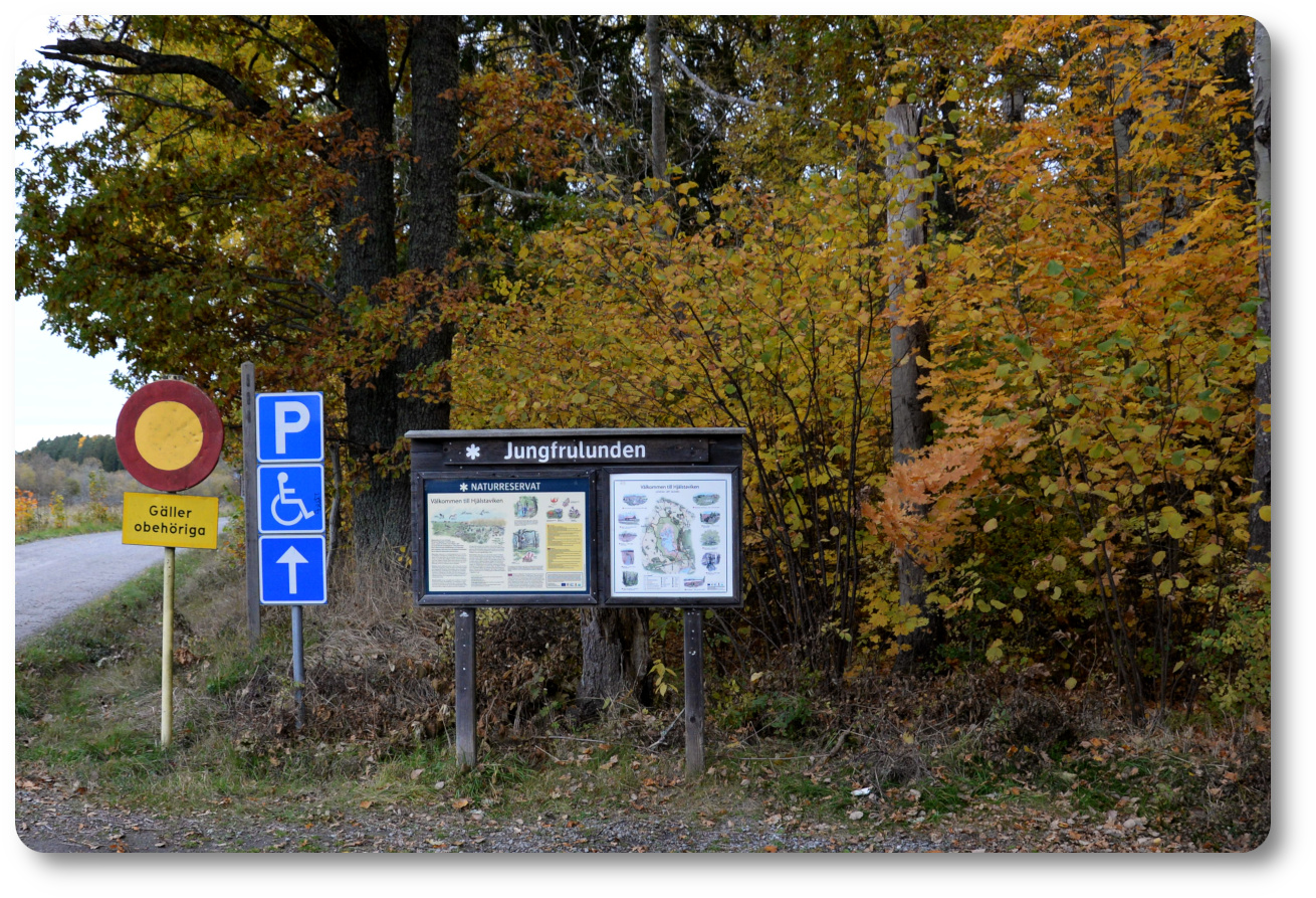 Oktober, 2025. Informationskylt vid parkeringen vid Jungfrulunden. Det finns även en liten parkering, som ligger 500 m närmare själva reservatet, för de som har funktionshinder.