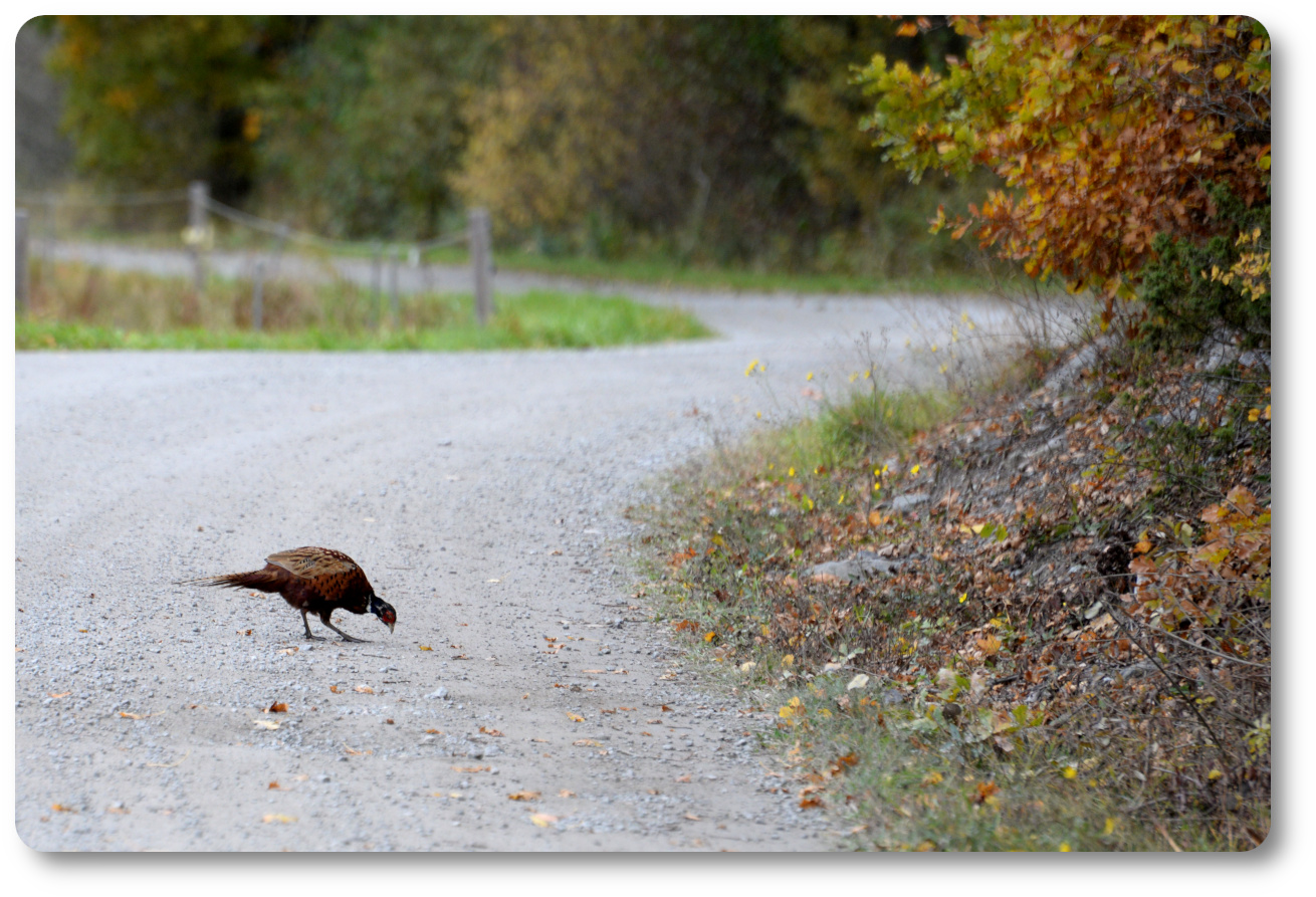 Oktober, 2025. Man får, liksom fasanen, gå ca 500 m. på denna grusväg innan stigen börjar.