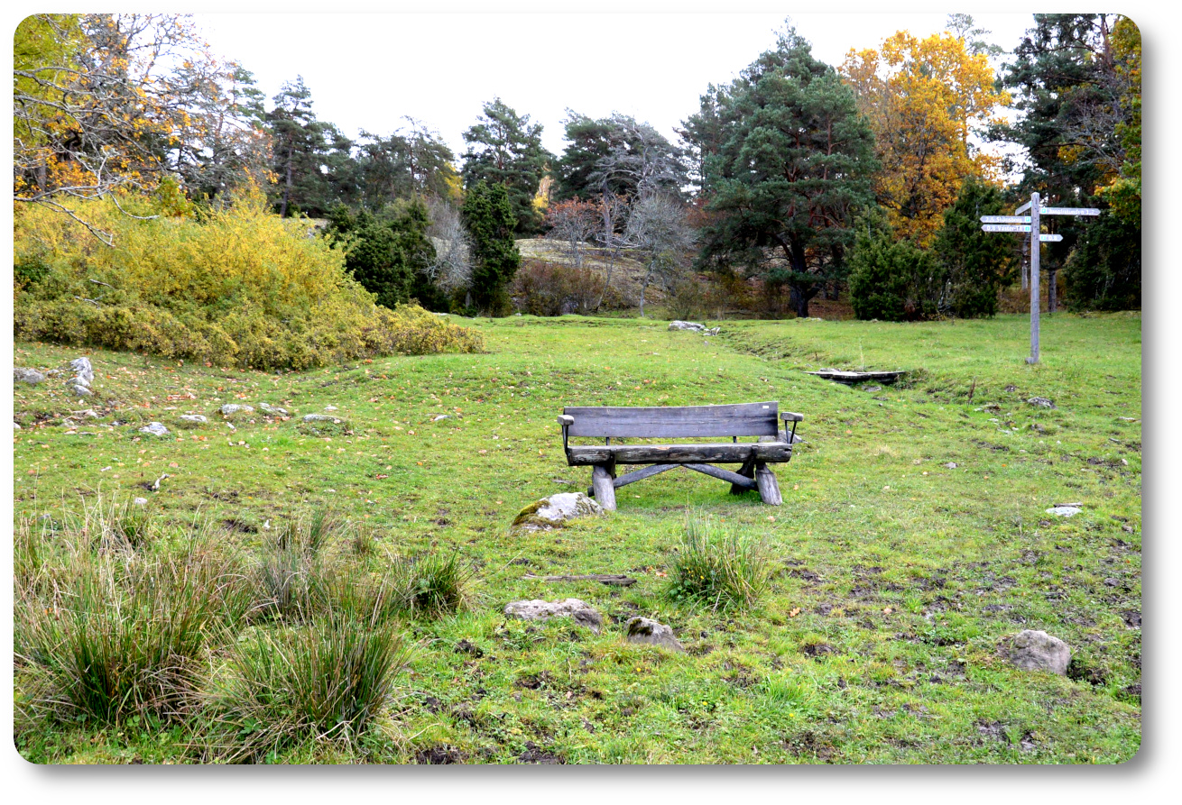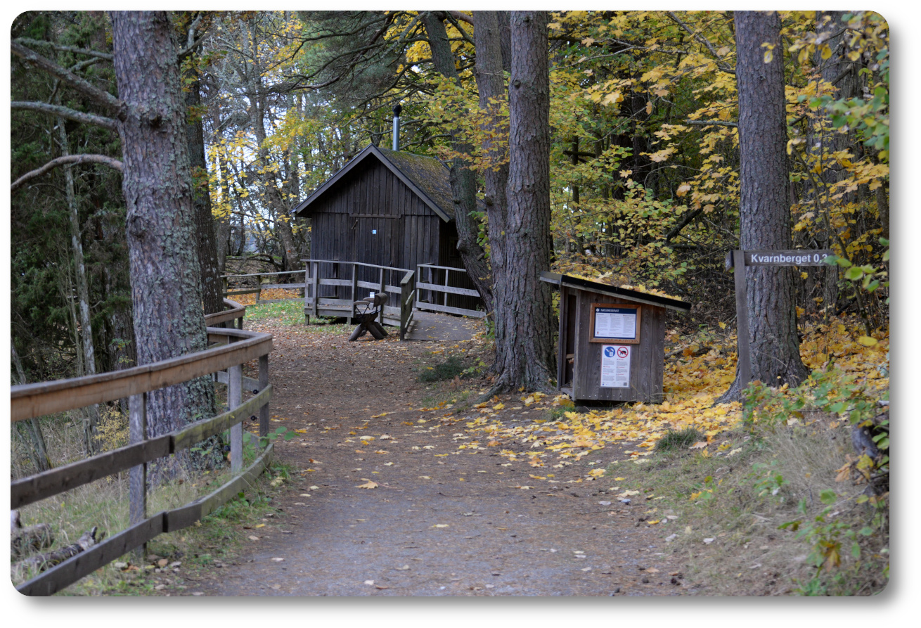 Oktober, 2925. Här kan man välja mellan att gå rakt fram och följa stranlinjen eller vika av mot höger och gå stigen upp mot Kvarnbergets topp. Här finns toa och vedförråd samt en vinterfågelmatning.