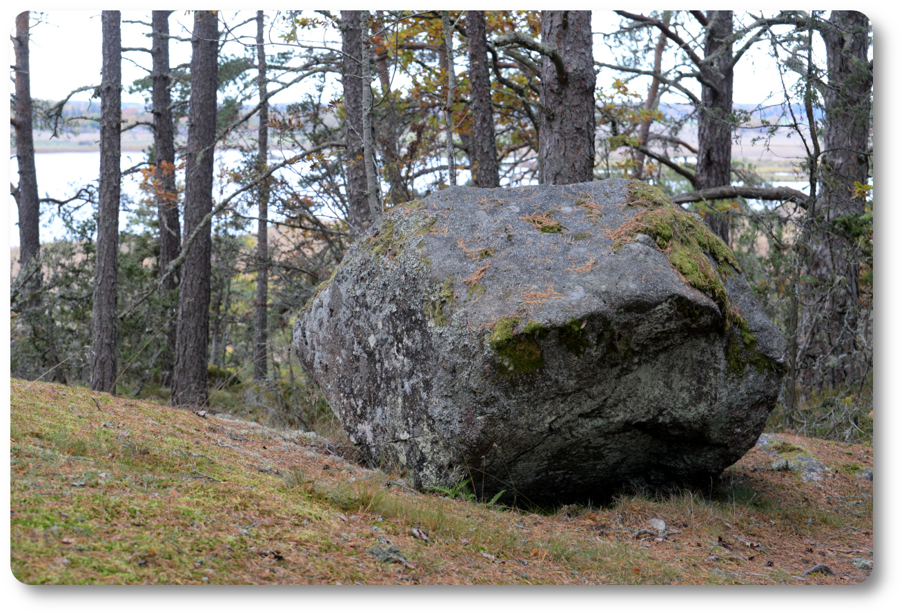 Oktober, 2025. Vägen ner mot vattnet på den norra sidan är inte alls så brant som där man kan gå upp. Några stora stora stenblock passeras på vägen ner och bakom tallarna kan man skymta Hjälstaviken.