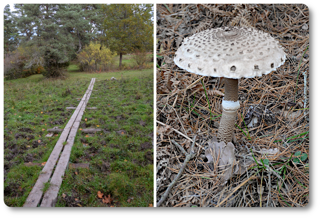 Oktober, 2025. Så småningom kommer man ut på en sank strandäng, som betas av kor. I området hittades några fina stolta fjällskivlingar.