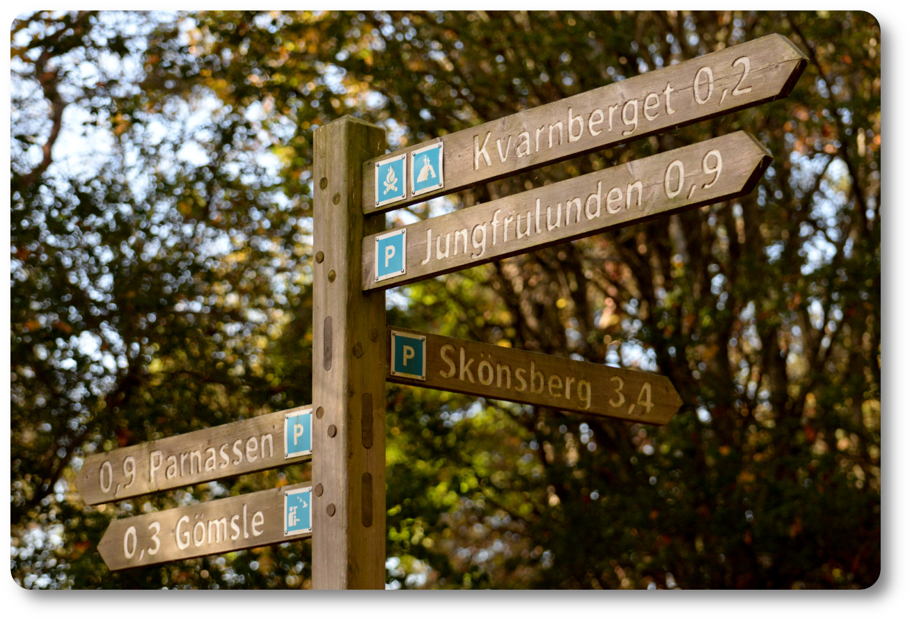 Oktober, 2025. Här har man kommit ner från Kvarnberget och fortsätter man åt vänster kommer man till Väste-Kil (0,8 km) och därefter till parkeringen i Skönsberg (2,5 km). Går man tillbaka till höger på stigen genom skogskanten kommer man till Jungfrulunden (1,7 km).