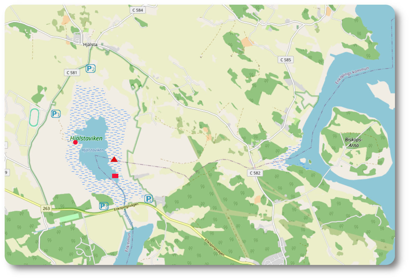 Karta över Hjälstaviken. Parkeringen vid Jungfrulunden ligger vid P4. Den röda triangeln visar läget för toppen på Kvarnberget och den röda fyrkanten visar platsen för vassgömslet. Den röda cirkeln visar platsen för fågeltornet vid Hårby.