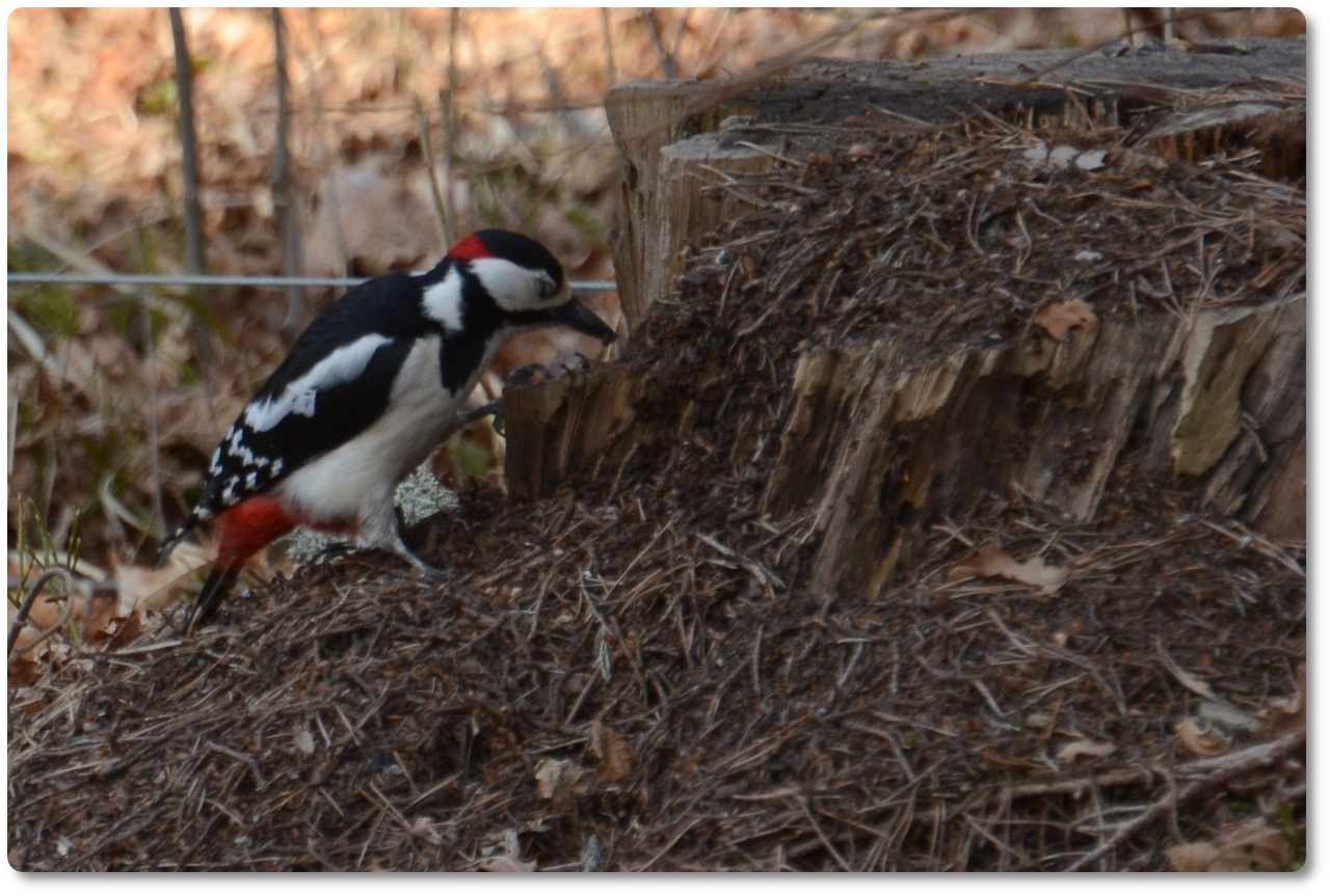 Mars, 2022. Större hackspett, som födosöker i en myrstack. Bilden visar en hane, som har röd nackfläck