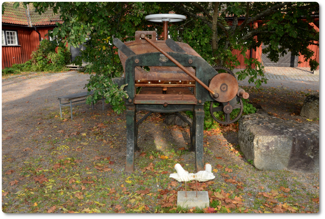 Oktober, 2023. Bilden visar en gammal maskin, som kan vara en tryckpress (om någon vet säkert, skicka gärna info via kontaktsidan). I förgrunden står ett alster från någon av eleverna på konstnärsutbildningen.