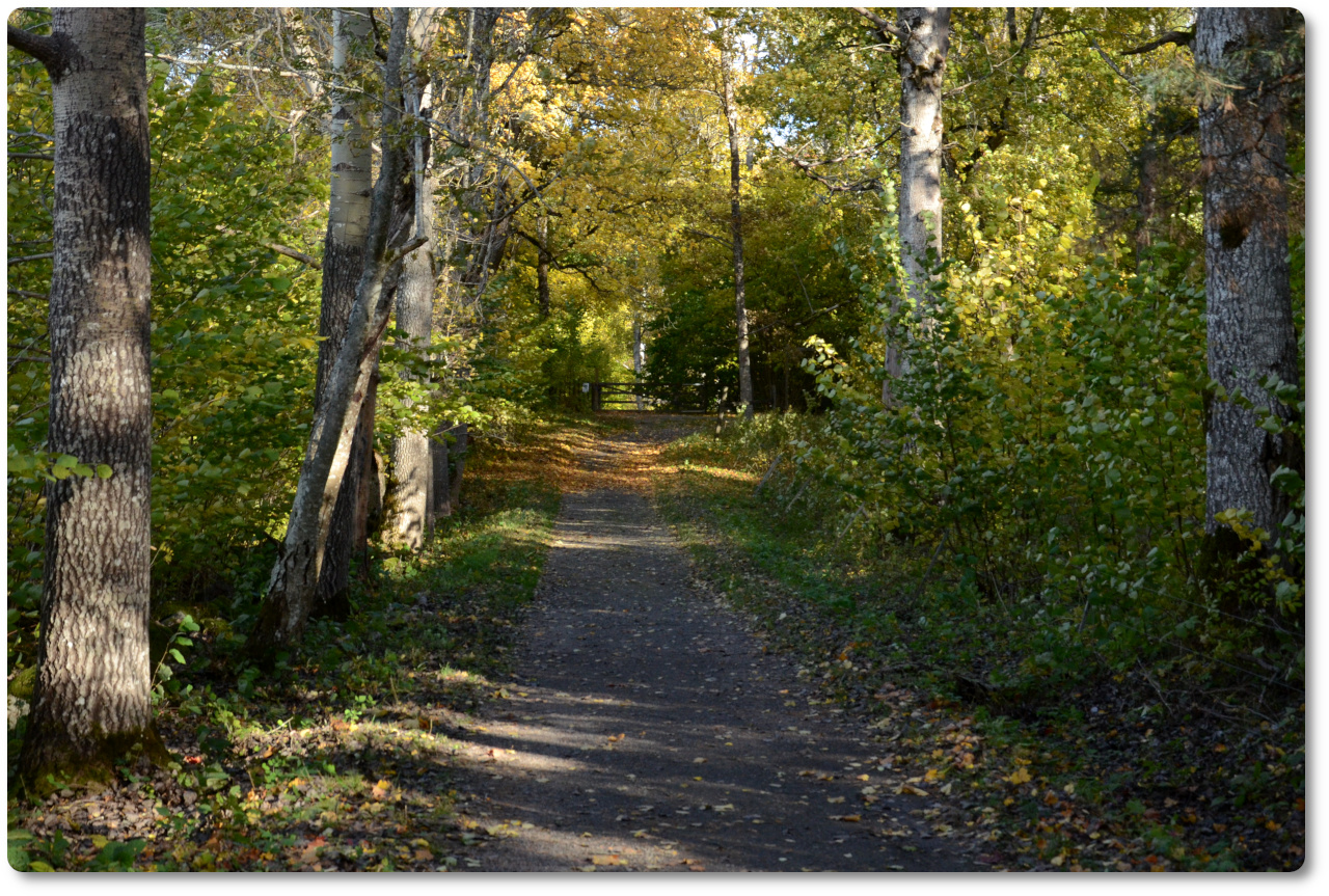 Oktober, 2023. Från konstverkstäderna går en smal väg och en allé med en gammal stenmur, som leder till den s.k. "Gravkullen". Vägen går längsmed naturparkens västra sida.