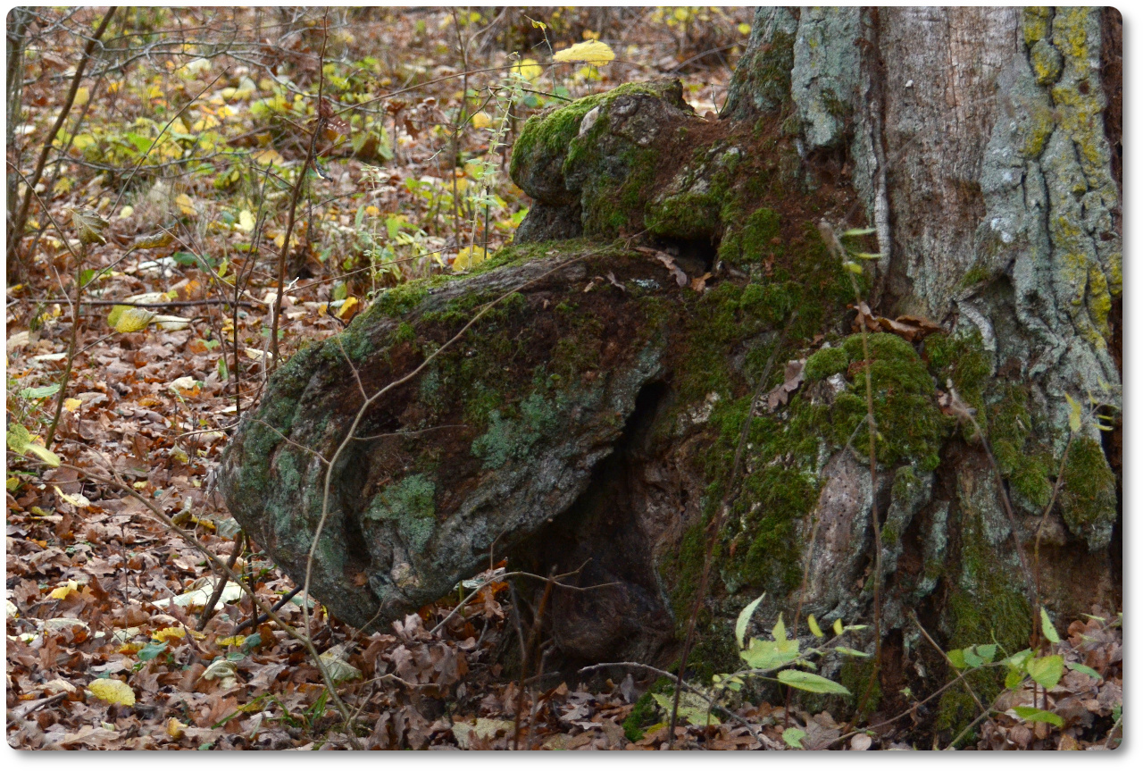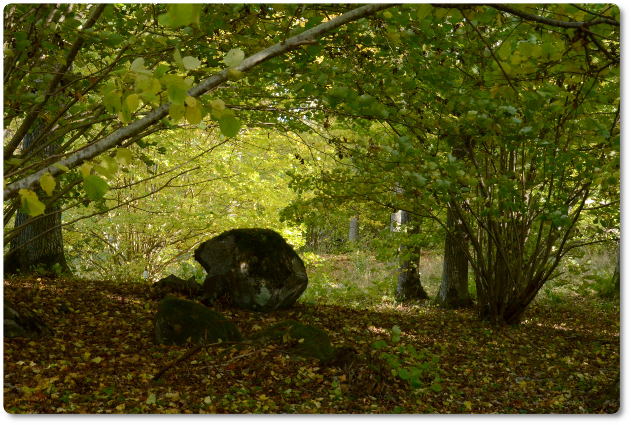 Oktober, 2023. Om man tittar in under hasselgrenarna i närheten av "Gravkullen", ser man denna sten, som förefaller ha ett hål i mitten, men det är nog en synvilla.