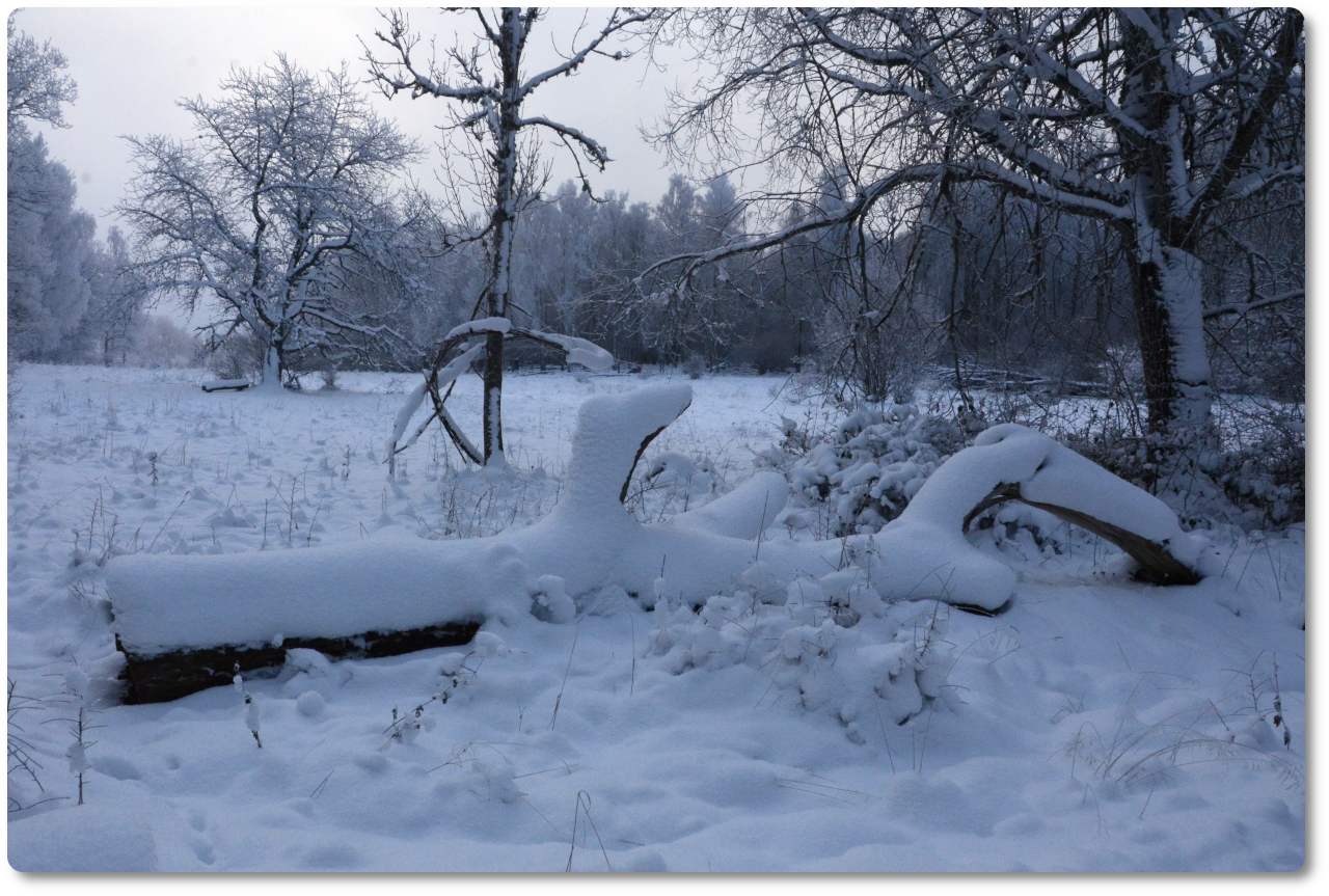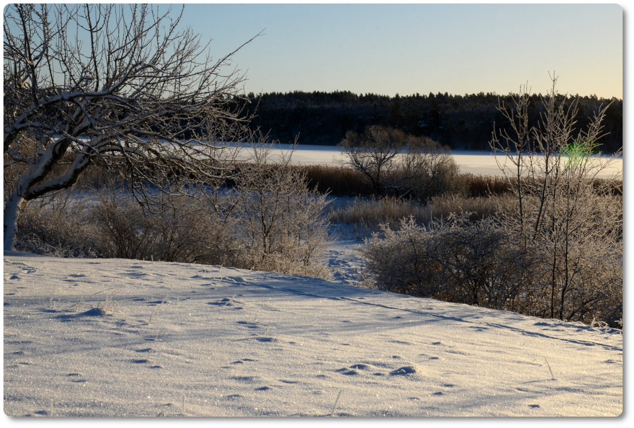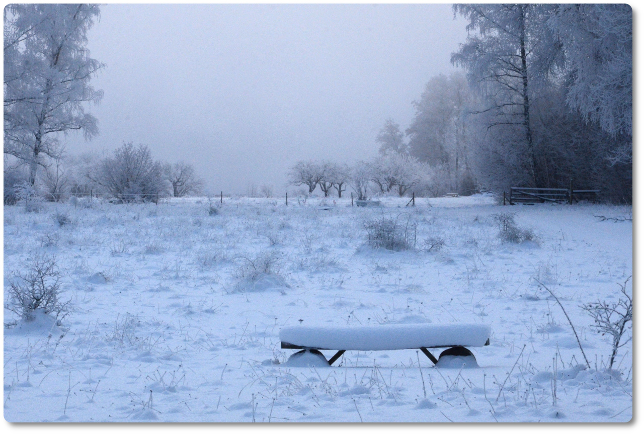 December, 2023. Bilden visar Lundängen från den södra sidan. Pilen till vänster på bilden döljer tyvärr en fantastisk sak. På andra bilden härifrån i bildspelet, kan du se vad det är. Träden vid kanterna av ängen är vackert dekorerade med rimfrost. Kolla även nästa bild, som visar ... ... ...