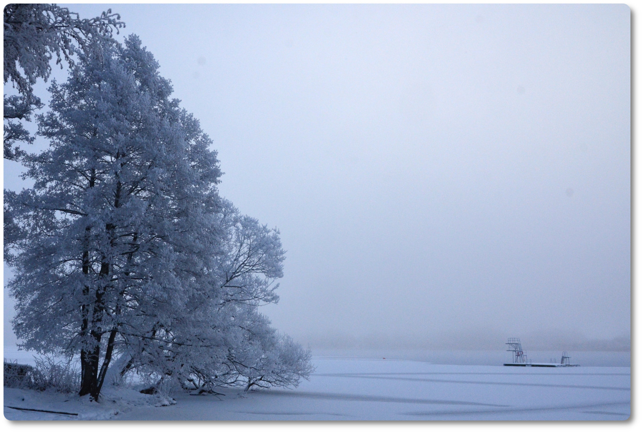 December, 2023. Strandängen (den västra) ser verkligen inte så inbjudande ut nu, när den är inbäddad i snö och dis, men på våren är det ett fantastiskt fågelliv här.