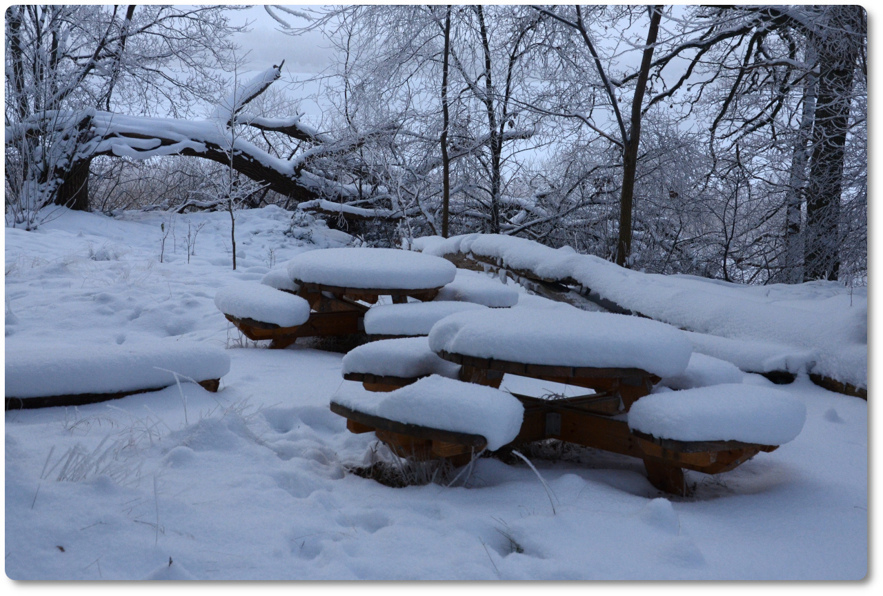 December, 2023. Bänken vid den norra delen av Lundängen inbjuder inte längre till en fikastund. Det var -15° när bänken fotograferades.
